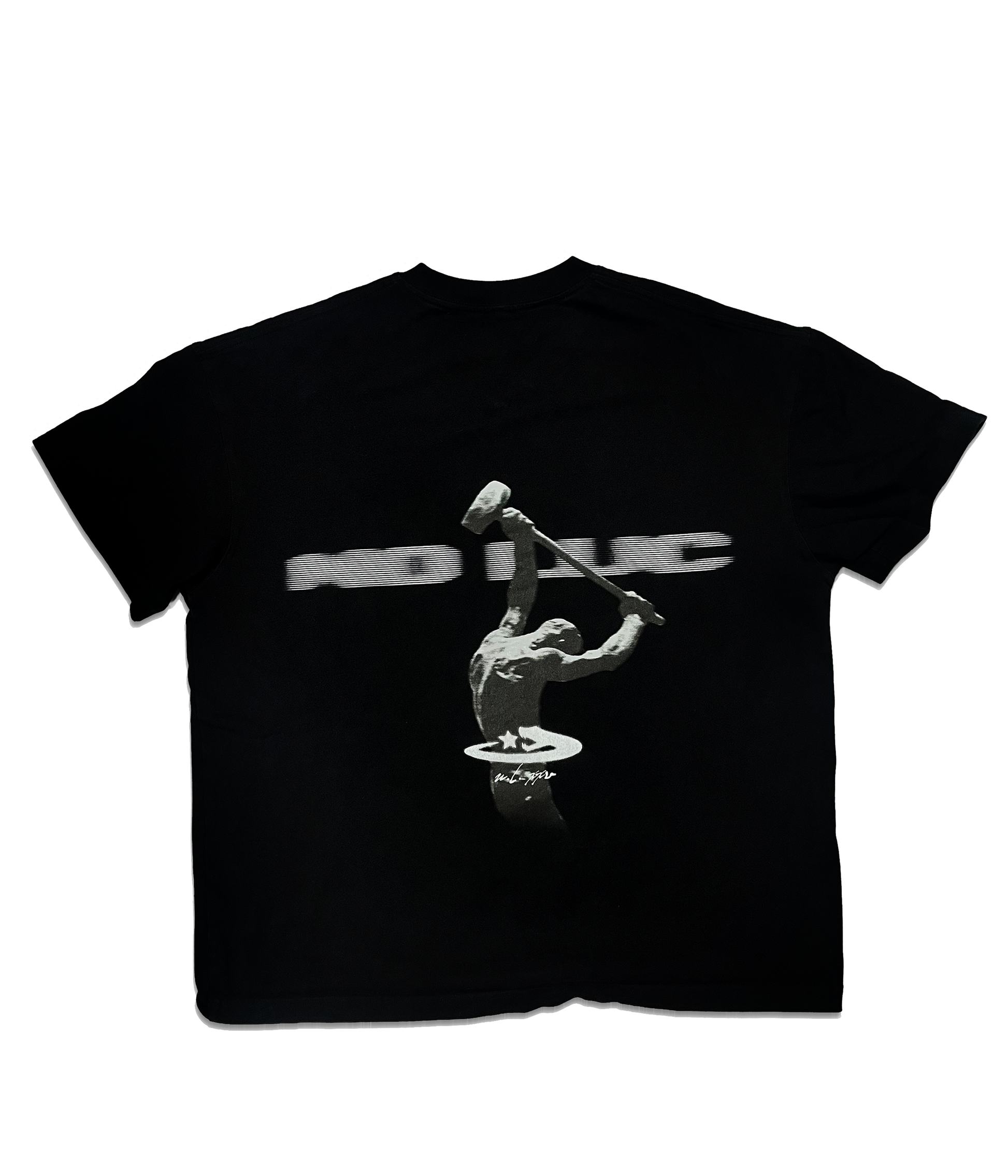 Design: Minimal front featuring the No Luc wordmark at the chest. Back print showcases a bold figure striking with a hammer over a large No Luc logo, finished with the brand’s symbol beneath.